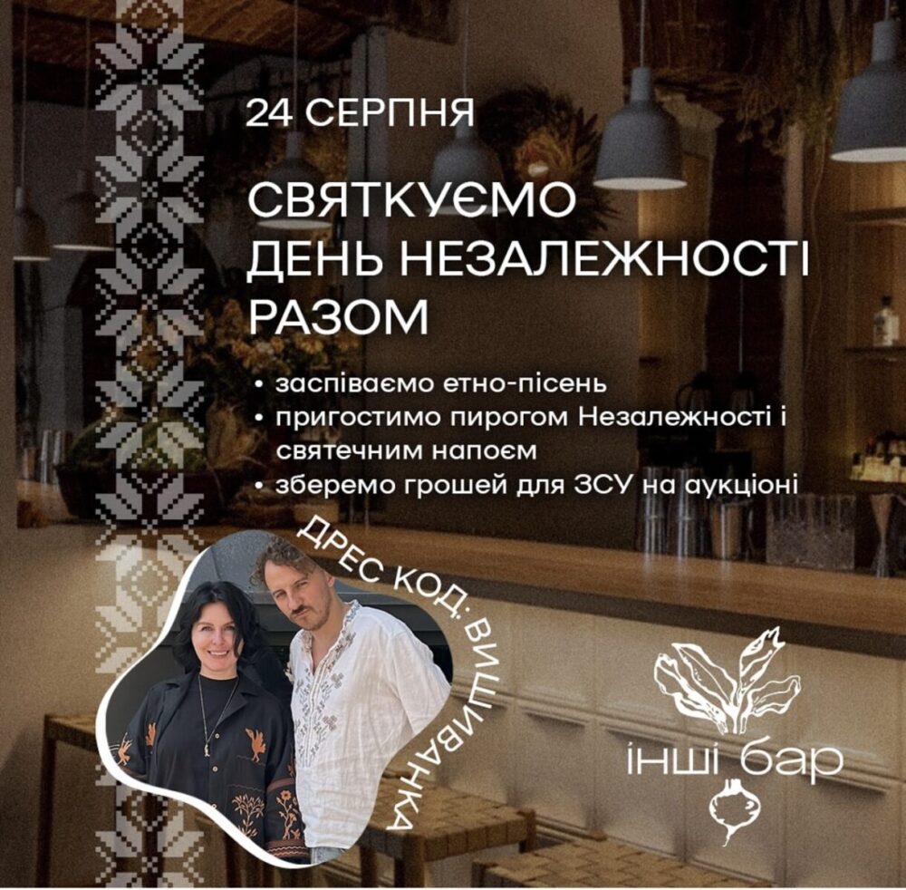 До Дня Незалежності у барі окрім коктейлів будуть етно-співи, аукціон, щоб зібрати грошей для ЗСУ, пригощання пирогом Незалежності та святечним напоєм.