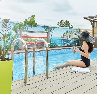 Відкритий басейн на даху, глибина якого 130 см. Для дітей є ігрова зона та міні басейн. По всій терасі є шезлонги: біля басейну, під парасольками та під накриттям. На терасі також можна замовити їжу та напої.