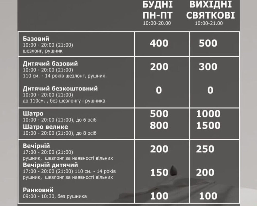 Зі зручностей – оренда рушників, лежаки, парасольки та передягальня.