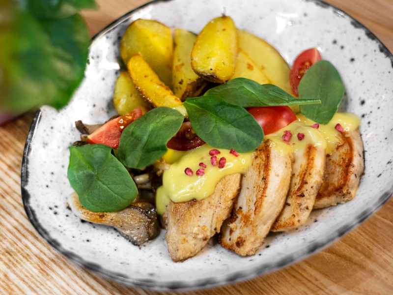 •Боул з картоплею, куркою і гливами;