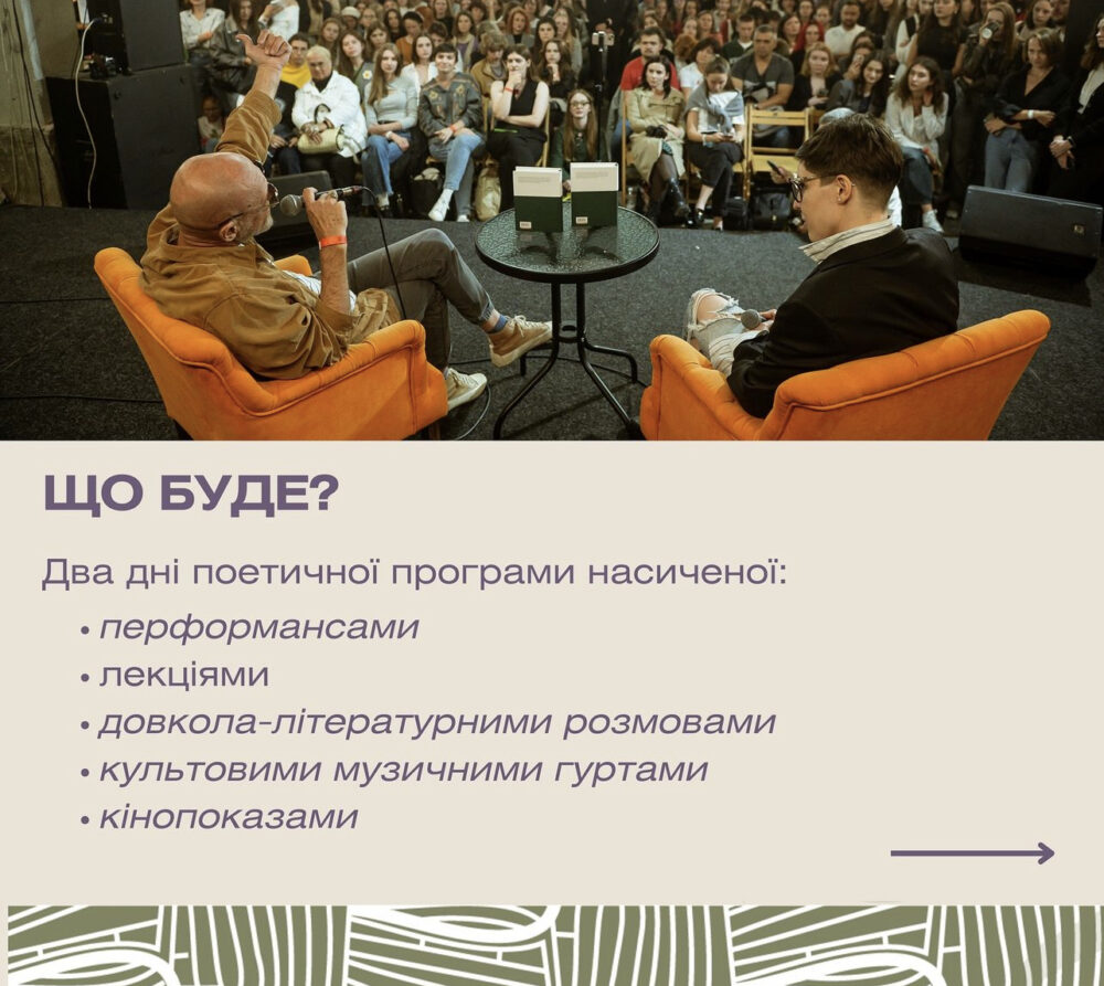 Міжнародний благодійний фестиваль, участь у якому візьмуть пів сотні поетів та поеток різних поколінь. Також у ці дні на подію приїдуть письменники з Польщі, Литви та Хорватії.