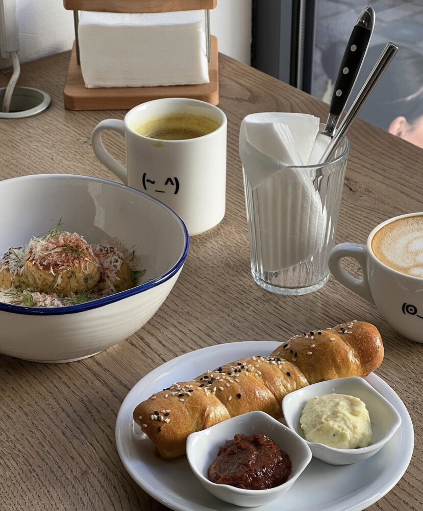 З напоїв – «чорна» чи «біла» кава з молоком, холодні напої й матча, чай, лимонади, смузі та фреші. В меню є сирники, гранола, веганський сендвіч – їх подають цілий день. Також є різноманітна випічка та десерти.