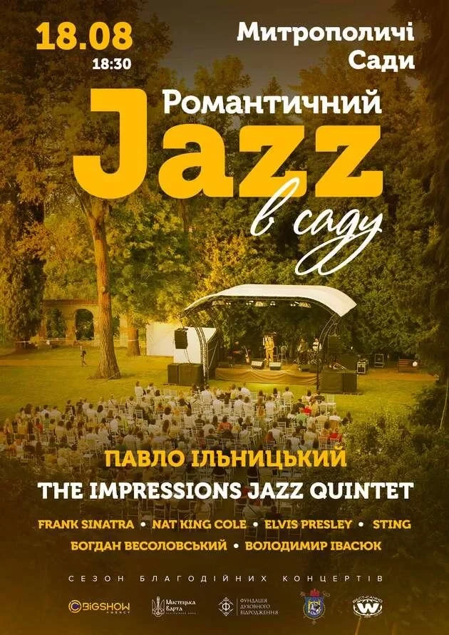 У вишуканих авторських інтерпретаціях цього вечора прозвучать найвідоміші з композицій, які подарували світові легендарні виконавці: Frank Sinatra, Nat King Cole, Sting, Elvis Presley. Ви також почуєте неперевершені пісні Богдана Весоловського та Володимира Івасюка. Музиканти The Impressions Jazz Quintet на чолі з неперевершеним Павлом Ільницьким подарують всім незабутній вечір.
