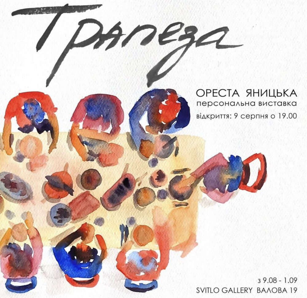 Серія акварелей “Трапеза” присвʼячена любові авторки Орести Яницької до буття разом із друзями і є результатом її рефлексій та спостережень на тему сакральності спільного споживання їжі. Трапеза – це час особливої близькості з друзями та з містом. У своїх акварелях мисткиня зображує знайомі багатьом дворики кавʼярень, силуети людей та розмови, які є частиною львівського досвІду.