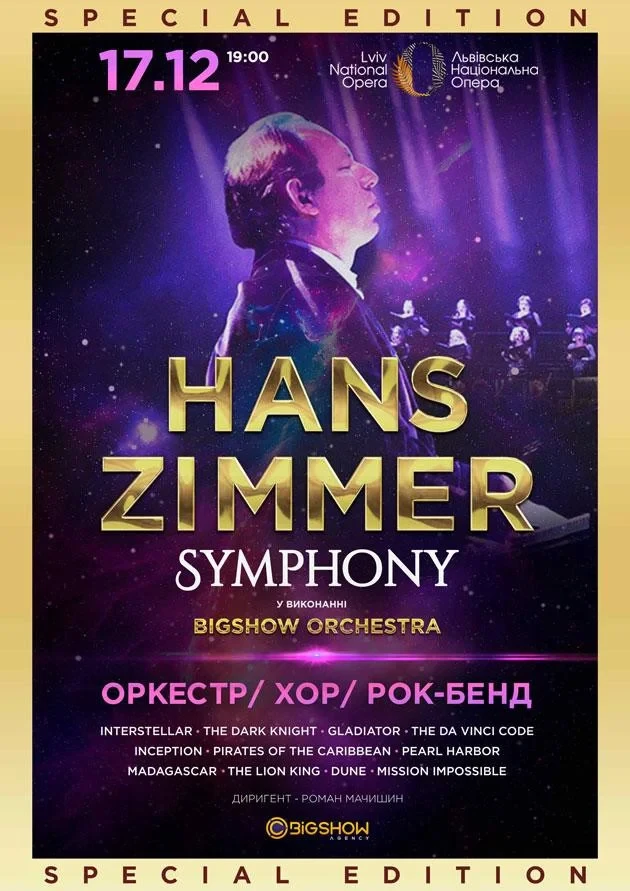 На концерті виступить орекстр BIGSHOW ORCHESTRA разом із рок-бендом, учасниками хору та кращими солістами. На концерті прозвучить музика до найвідоміших кіношедеврів сучасності: «Інтерстеллар», «Шерлок», «Гладіатор», «Початок», «Дюна», «Король Лев», «Пірати Карибського Моря», «Перл Харбор», «Мадагаскар» та інших.