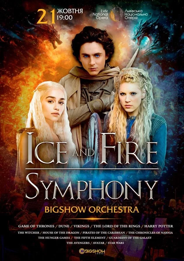 Саундтреки з кінокартин The Witcher, Dune, Harry Potter, Game of Thrones, Vikings, Guardians of the Galaxy, Pirates of the Caribbean, The Fifth Element, The Lord of the Rings, House of the Dragon, Avatar, The Hobbit, The Hunger Games та інших у живому виконанні симфонічного оркестру на сцені Оперного театру.