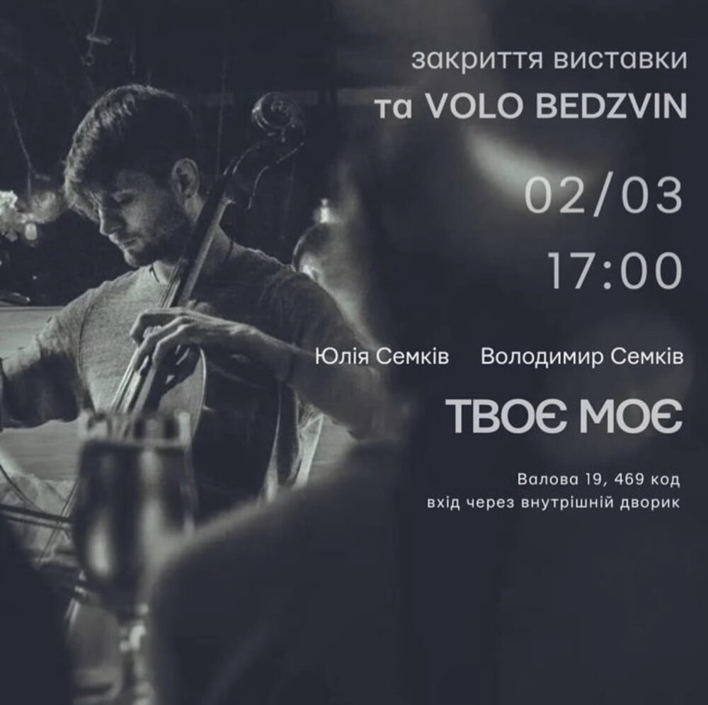 В суботу відбудеться фінальний перегляд виставки Юлі та Володі Семків «ТВОЄ МОЄ» в поєднанні із живим звучанням віолончелі у виконанні Volo Bedzvin.