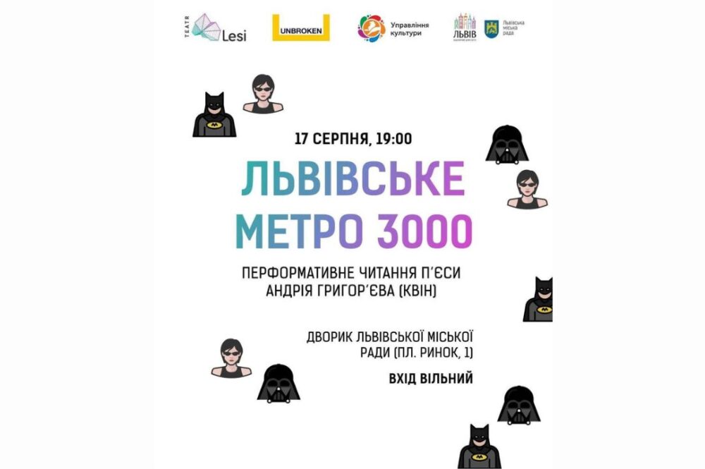 17 серпня о 19:00 у дворику ратуші, на пл. Ринок, 1, відбудеться перформативне читання п’єси ветерана Андрія Григор’єва «Львівське метро 3000» від Театру Лесі Українки.