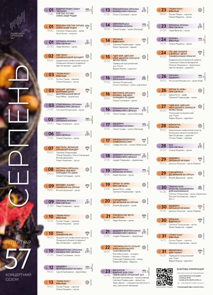 - екскурсія Органним залом — 23 серпня. Історія будівлі, найбільший історичний орган і трохи залаштунків від команди залу;