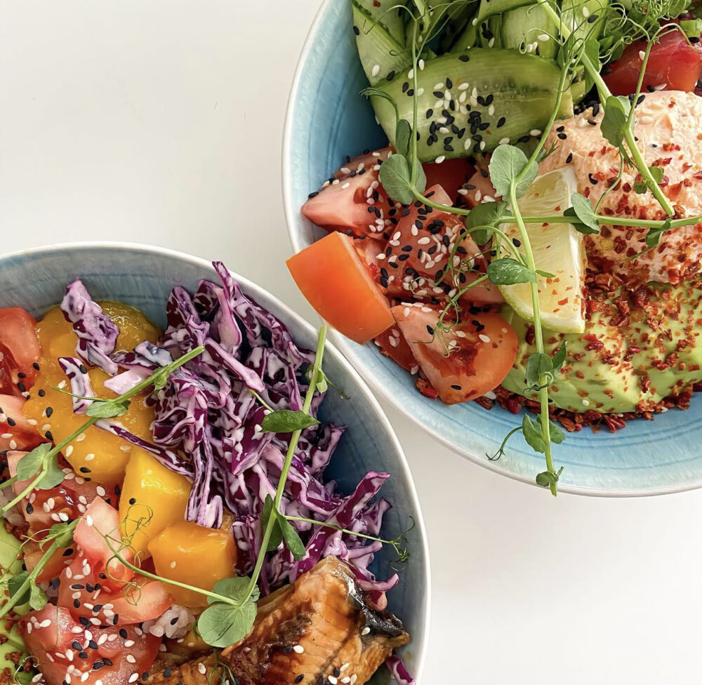 - Шрімпс боул – креветки, помідори чері, авокадо, сир фета й рукола. Посипаний арахісом, а також заправлений оливковою олією та зеленим йогуртовим соусом;