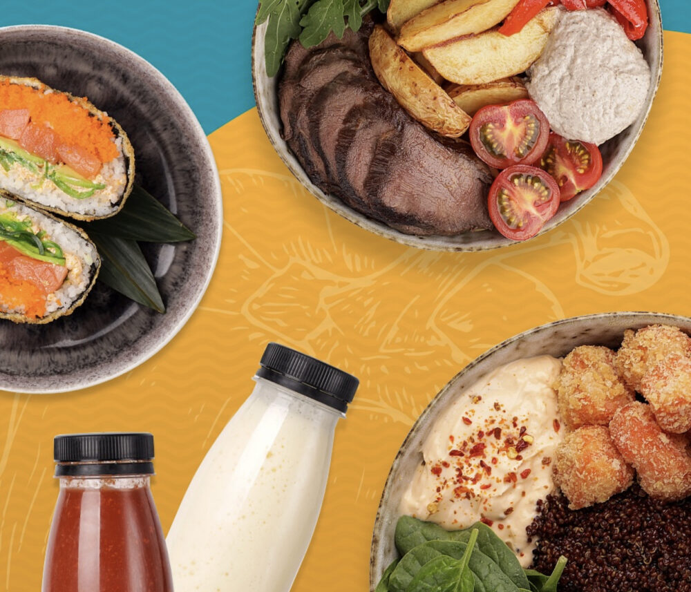 - Боул з куркою теріякі – філе су-від у соусі теріякі, рукола, буряк, сир фета, морква бейбі та кукурудза. Заправлений грін йогуртовим соусом і соєво-гірчичним соусом;