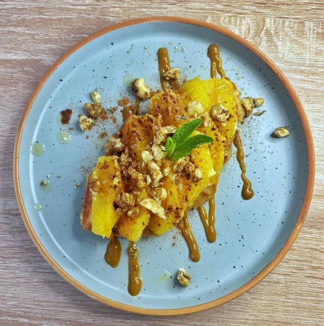 - Крофл апельсиновий – солодкий крофл із карамельним соусом, апельсином, волоськими горішками та корицею;