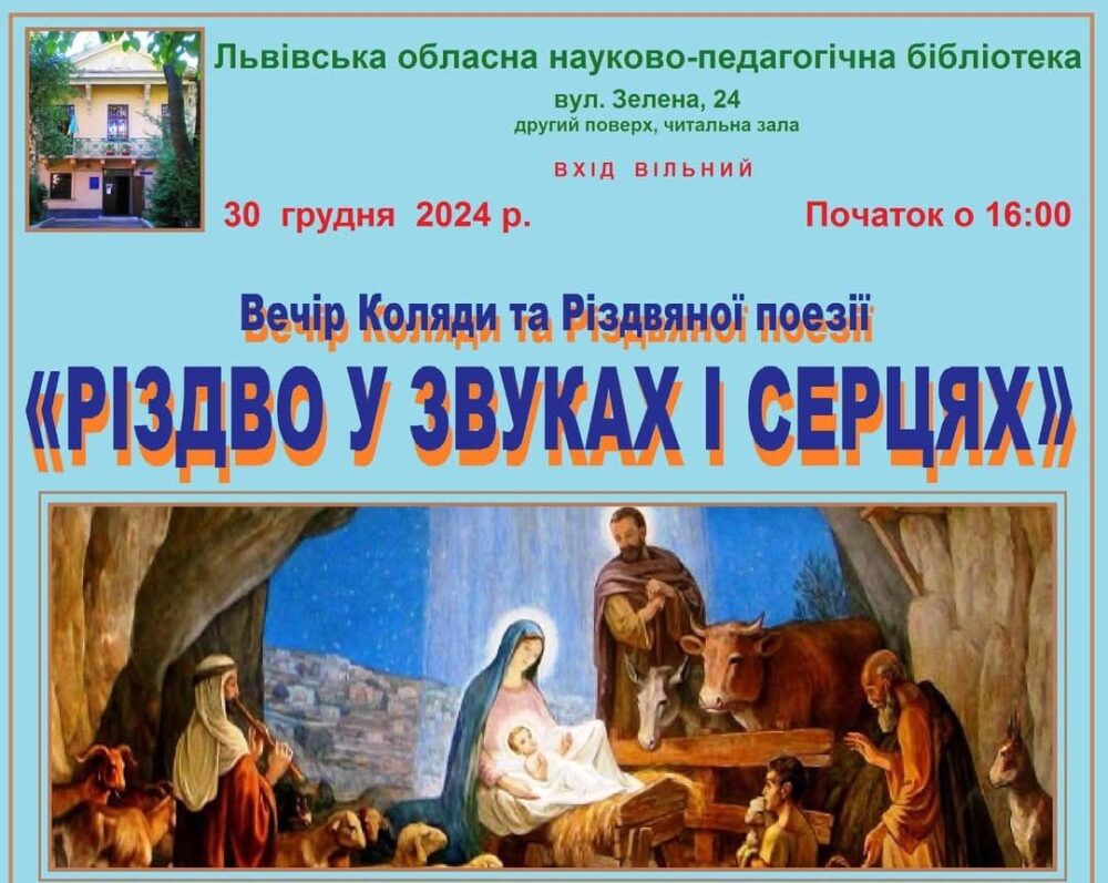 Львівська обласна науково-педагогічна бібліотека запрошує у понеділок, 30 грудня, відвідати вечір коляди та різдвяної поезії «Різдво у звуках та серцях».