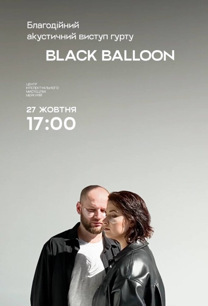 Київський інді-гурт Black Balloon виступить із благодійним акустичним концертом у Львові. Гурт поєднує інді-поп та інді-рок, досліджуючи нове звучання української музики. У їхній дискографії англомовний мініальбом | Have Won (Actually Not), альбом «Далі вище» та сингли «Втеча», «Пробач», «Кипариси». Їхні пісні — це рефлексія почуттів: любов, дружба, страх, гнів, сила, втома — усе, що ми відчуваємо щодня.
