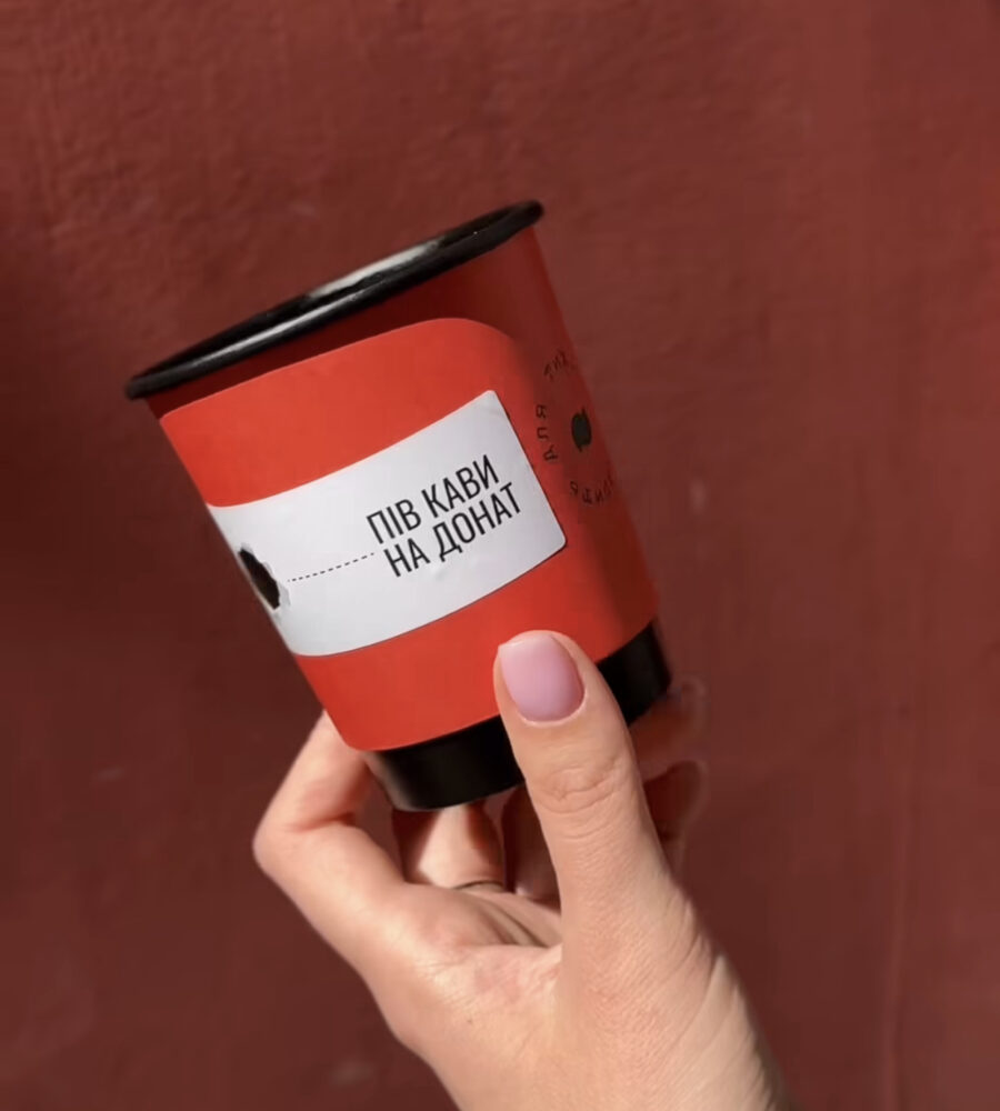 «Пів фільтру за донат» – благодійна ініціатива, в межах якої ви платите повну ціну, отримуєте пів чашки кави, а решта йде на машину для 24-ї окремої механізованої бригади імені Короля Данила.