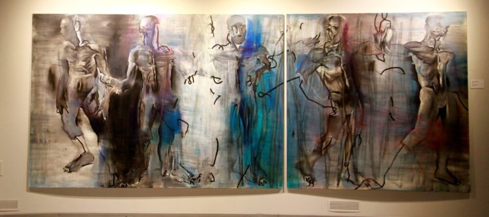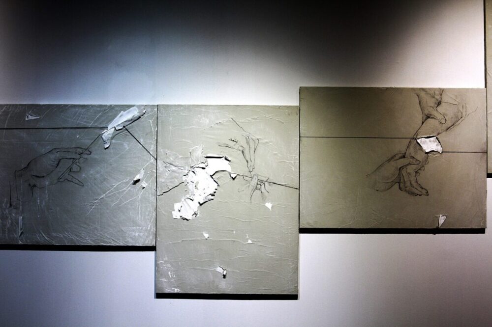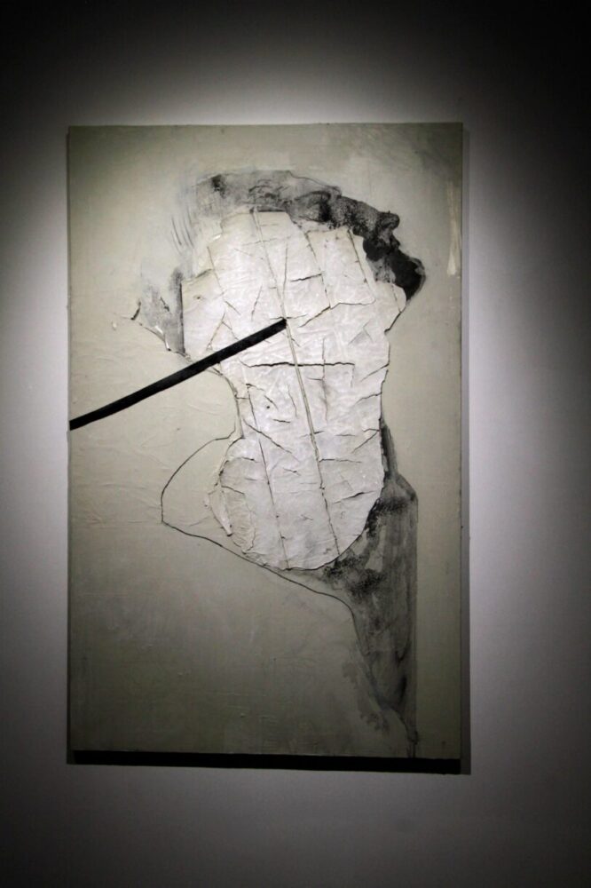 Розглядаю роботи в її залі. Більшість картин на сірому потрісканому тлі, немов це стара полущена фарба, кілька – на вугільно-чорному. Авторка розповідає, що вони намальовані на заготовках для левкасу, тому їхня основа нагадує текстуру стіни – певного бар’єра. Це діалог про останню межу: де особиста територія і де вона може бути порушена, як перебудовувати її відновленою і зціленою.