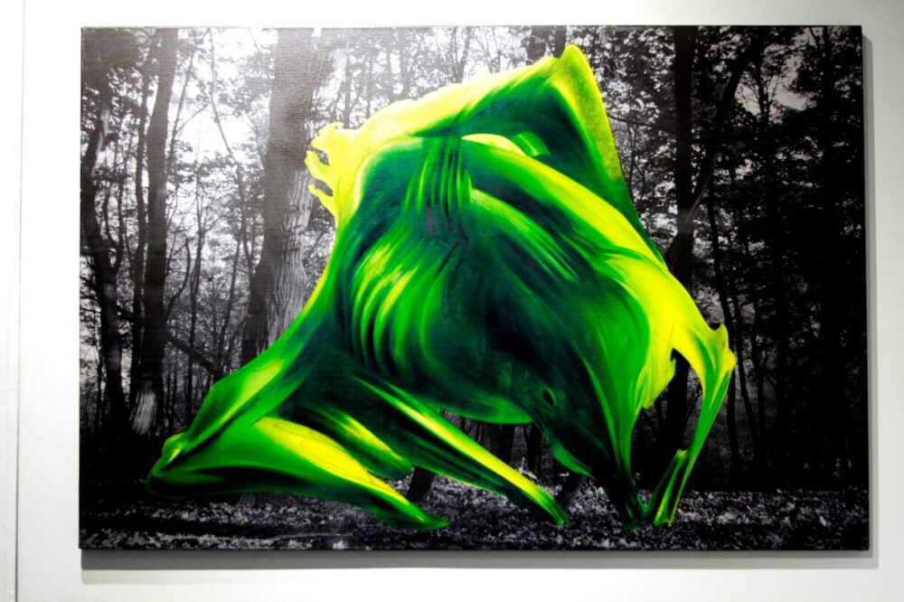 «Це серія живописів METAFOREST, 2021, уперше представлена 18 лютого 2022 року. Її супроводжував досвід віртуальної реальності. Тут я порушила тему метавсесвіту, нового цифрового майбутнього. Як нам придумувати нові закони і правила, за якими житимемо в цьому метавсесвіті, і яка роль природи в ньому. Але 24 лютого виявилося, що ми все ще печерні люди і метавсесвіт для нас наразі неактуальний», – з гіркотою в голосі говорить художниця.