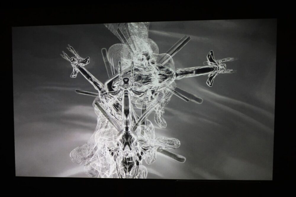Не встигаю осмислити все побачене. Море почутої та візуально сприйнятої інформації синхронізується в голові з історією про метавсесвіт. Ловлю себе на тому, що вже не зовсім розумію, де я: в реальності чи якомусь мареві. Але це остання експозиція виставки «Моя територія». Треба зробити ще один ривок і можна буде видихнути. Напевно… Заходжу в приміщення і чую якесь бубоніння. На нього накладається пищання протипожежної сигналізації чи, може, охоронної системи – додаткові звукові ефекти через знеструмлення.