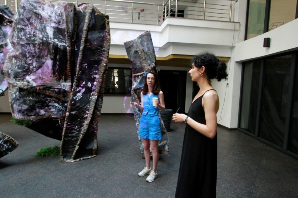 Фотограф добіг. Заходимо в будівлю і наче потрапляємо в інший світ. У холі бачу початок проєкту «Моя територія»: велетенські – з цілий поверх заввишки – артоб’єкти. Вони схожі на каменюки, з яких де-не-де пробивається зелень чи то лишайників, чи невеличких рослин із малесенькими листочками. На них грають відблиски світла. Придивившись, помічаю, що це наче й не каміння, бо артоб’єкти зшиті з різних великих шматків чогось – тканини чи банерного полотна – грубими нитками і широкими стібками. В голові одразу виринають образи з доісторичних часів про життя печерних людей. Зауважую на стіні ліворуч від входу відеопроєкцію – руки, які зшивають тканину. Ага, значить правильно зрозуміла.