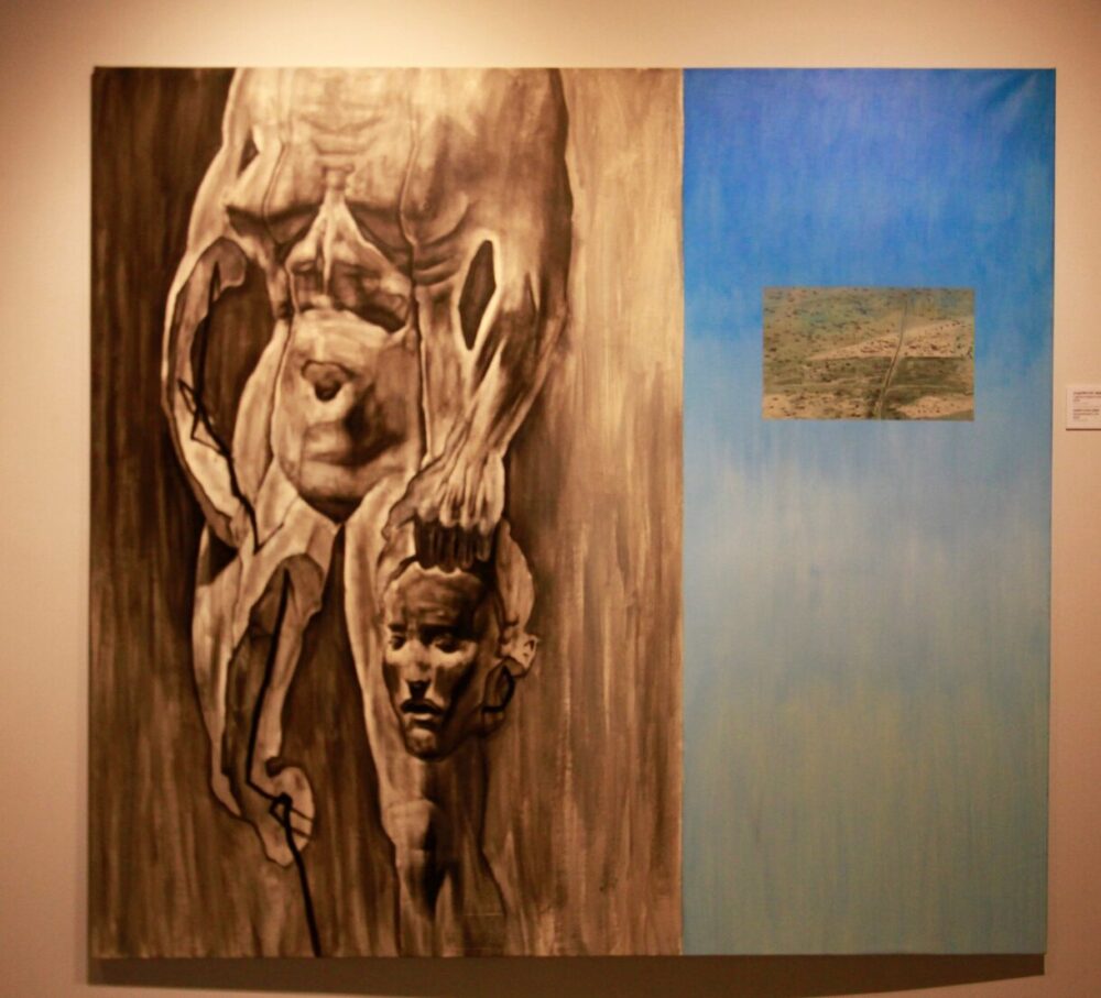 Це передпоказ проєкту «Моя територія», тож маю нагоду почути тлумачення його творців. Для 29-річного львів’янина Андрія Роїка це перша масштабна експозиція. В першому залі полотна з зображеннями людських фігур. Замість рук у цих тіл – дротяні гаки. На одній з робіт обіймаються чи то борюкаються два герої. Поруч – невелика кольорова фотокартка, де в такі же позі зазнимковані два хлопчики.