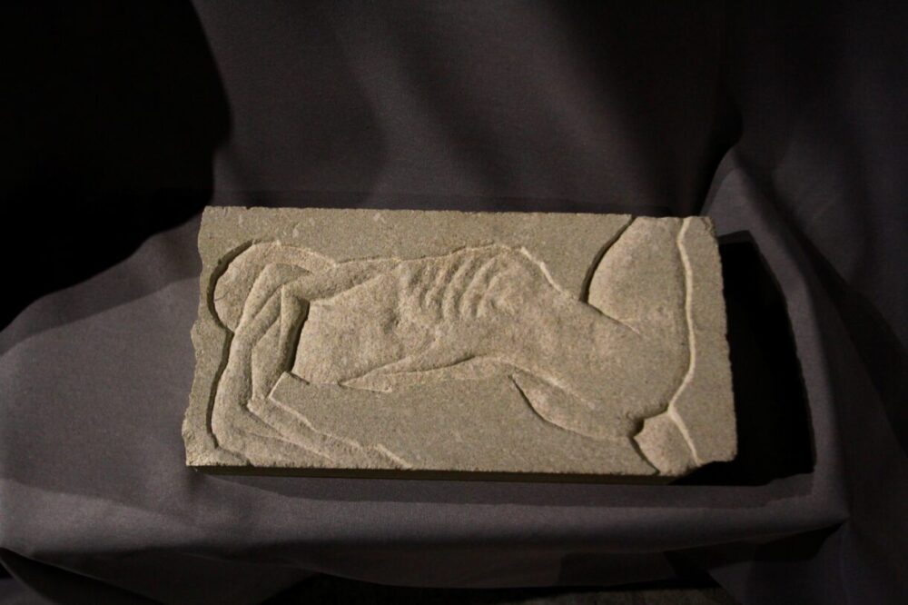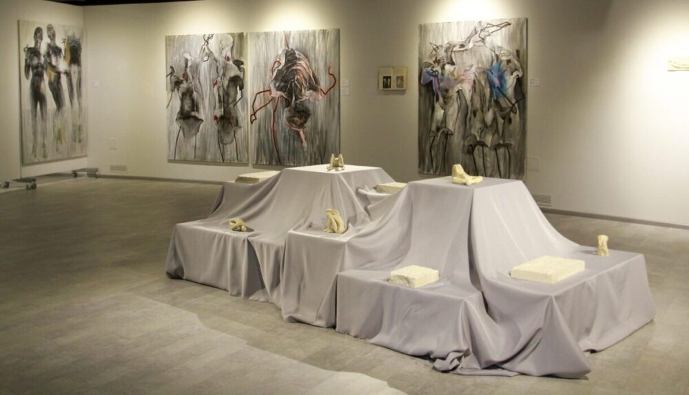 У другому залі бачу продовження серії. В центрі – постамент, на якому розставлені керамічні фігурки людей у стилістиці полотен. Тут же барельєфи і горельєфи на піщанику. Їх створення було безпосереднім руйнуванням і символізує те, що відбувається зараз. У третій залі – два полотна, створені до повномасштабного вторгнення, вони супроводжують глядача до інсталяції: тюль – символ злагоди, спокою, домашнього побуту, миру, на ньому – уламки скла і каміння, що зупиняють все навколо роботи «Карт-бланш». Вона – про безперервне навчання і готовність людини вчитися за будь-яких умов, навіть зараз.