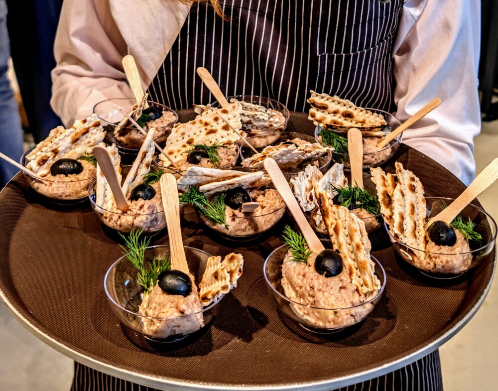 «Ми подаємо так званий ґегатке герінг, тобто січений оселедець, відомий також як форшмак. Це традиційна єврейська страва з оселедця, посіченого з горіхами, яблуками та цибулею», – пояснює господиня. Варто зауважити, що з форшмаком вона експериментує давно (відео приготування тут). На гастровечір подавала традиційний, як його готували її мама і бабуся. Але отут можна прочитати, як вона готує тирамісу-форшмак і м’ясний форшмак. Так, передусім це м’ясна страва прусської кухні, яка згодом перекочувала і прижилася на столах євреїв. А оселедці та інші звичні тепер складники форшмаку дешеві та завжди напохваті.