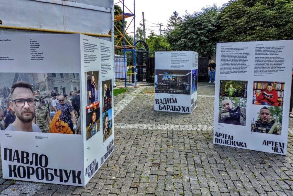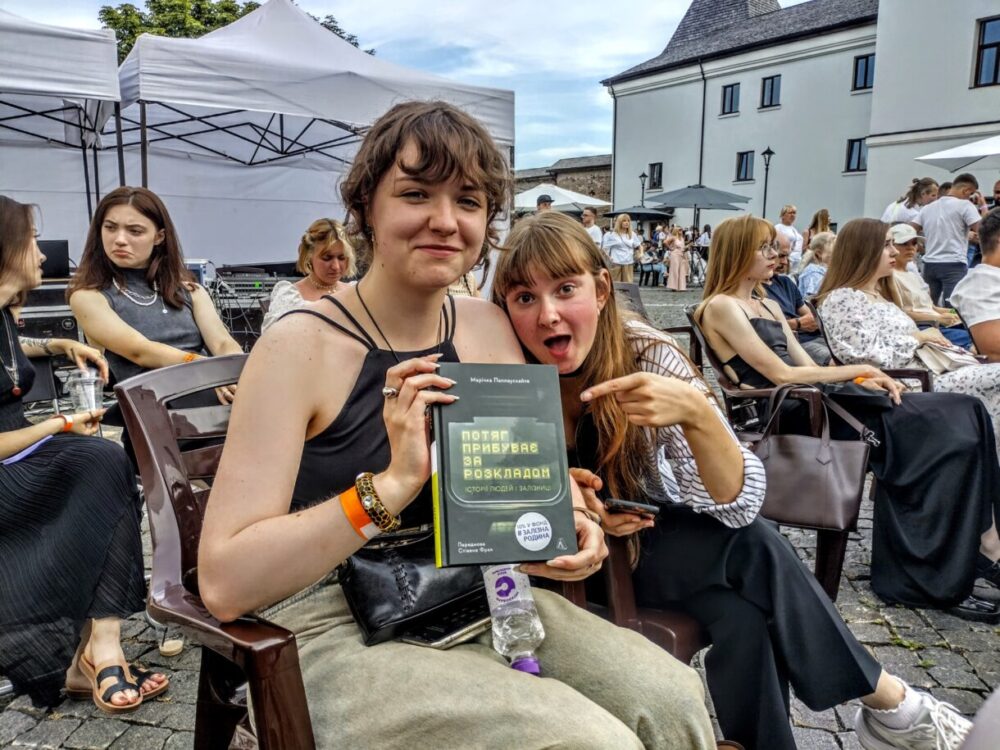 І хоч усім присутнім не треба було нагадувати, завдяки кому ми можемо бути на «Фронтері», ці нагадування були всюди. Від самісінького входу на локацію, за яким розташували вуличну виставку про письменників, які стали військовими. Один із них – лучанин Павло Коробчук – згадав про це в дописі на своїй фейсбук-сторінці. І хоч не зміг фізично бути на фестивалі, але тішився, що хоч так присутній на ньому. Були тут і цитати з його текстів, надруковані на футболках волонтерів. А от речник Міноборони Дмитро Лазуткін таки зміг вирватися на три години і стати учасником розмови та читань «Поміж сирен». Також на події я зауважила поета й перекладача Юрія Матевощука, а ще пластуна, мандрівника й ветерана Віктора-Миколу Гаврилюка, якому дивом вдалося врятувати ногу після тяжкого поранення в серпні 2023 року.