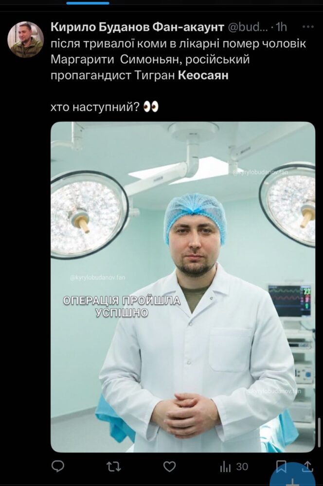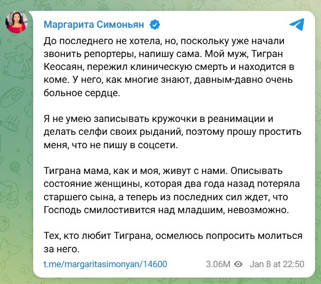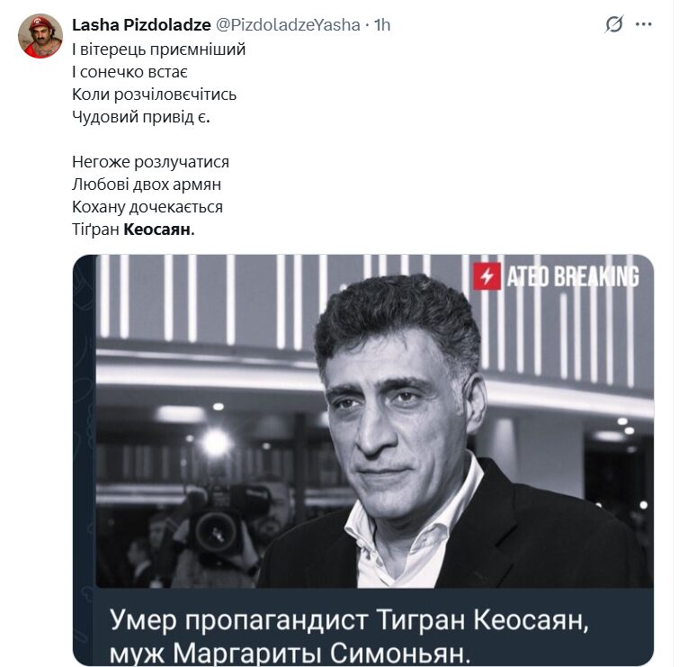 Цей день настав — 26 вересня помер російський пропагандист Тигран Кеосаян. Понад вісім місяців тому він пережив клінічну смерть й перебував у комі. Його дружина, керівниця телеканалу Russia Today та колега з пропагандистської діяльності, Маргарита Симоньян ще тоді писала, що не вміє записувати «кружечки» в реанімації й просила молитися за чоловікове здравіє.