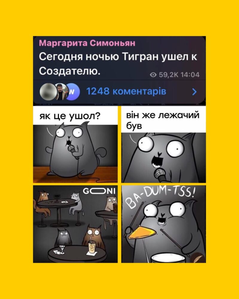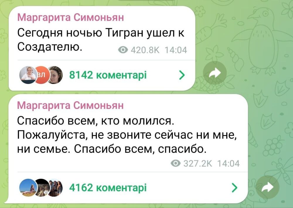 Молитви сяк-так допомагали до 26 вересня. Нині ж Симоньян написала, що вночі Тигран відправився до творця. Іронічно, що це трапилося у Всесвітній день контрацепції.