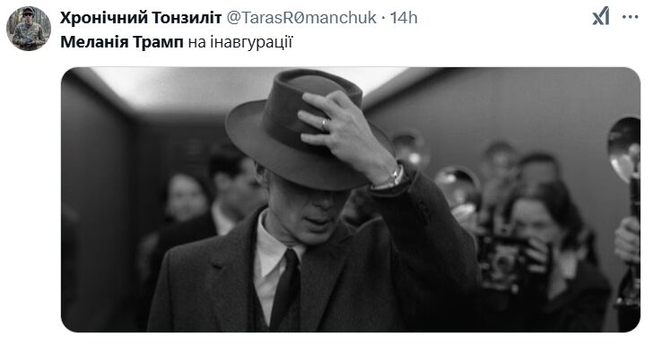 Проте повернімося до вчорашнього образу, який вже розтягнули на меми. Через капелюх Меланію порівнювали з кіногероями та реальними людьми, які підкреслювали своє вбрання схожим головним убором.