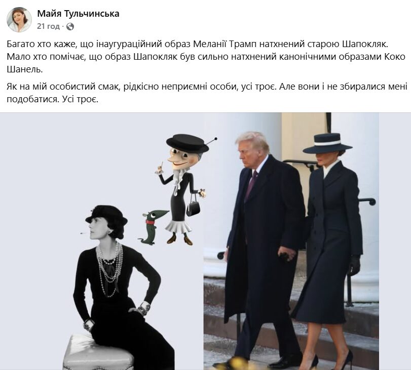 Майя Тульчинська, модна оглядачка та блогерка, зауважила, що Меланію Трамп порівнюють з мультяшною героїнею Шапокляк, у образі якої можна помітити характерний стиль Коко Шанель.
