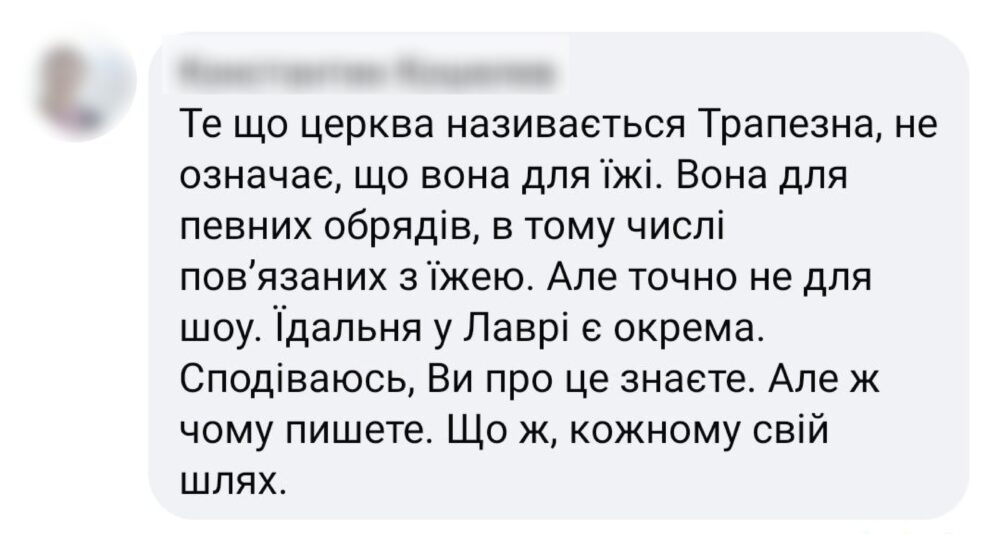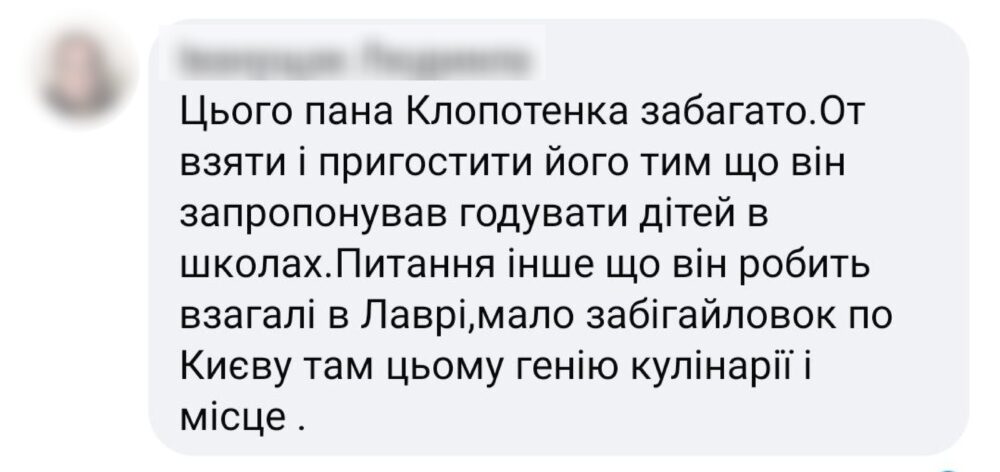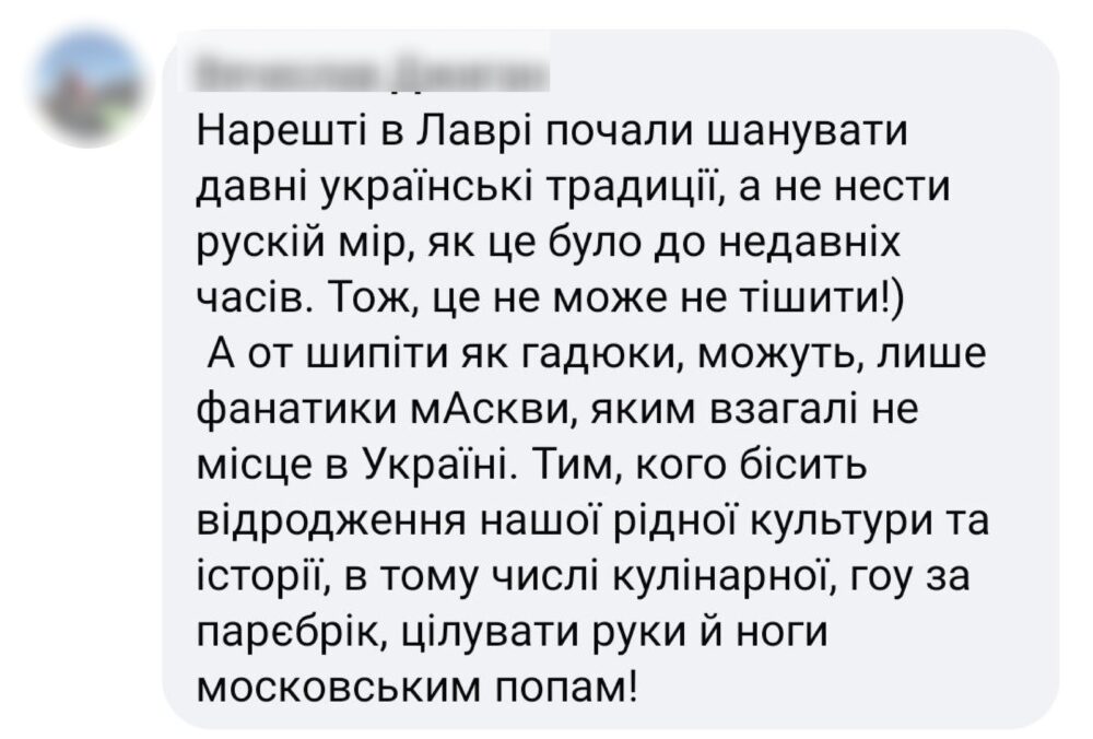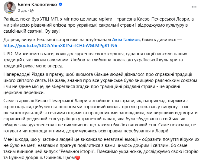 Євген Клопотенко на своїй фейсбук-сторінці написав, що раніше, коли у Києво-Печерській лаврі була УПЦ МП, він тільки мріяв про те, щоб знімати відео про українські страви.