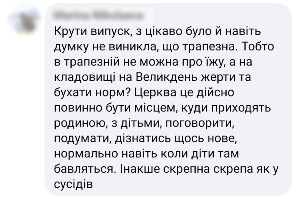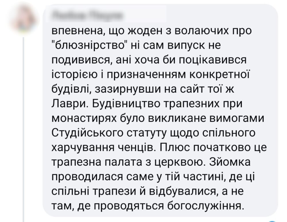 Дослідниця гастрокультури Олена Брайченко, яка брала участь у зніманнях, теж висловилася щодо хвиль незадоволення у соцмережах: «Виходить так, що готуєшся до інтерв’ю, систематизуєш страви за регіонами, шукаєш щось цікаве та нове про традиції святкування Різдва в Україні, аналізуєш, що змінюється… а потім з’являється сюжет й мова лише про те, чи можна готувати і їсти в церкві. З динаміки поширення обурення навколо цього випуску у мене є підозри, що це дуже зручно тим кого потрібно було вигнати з Лаври ще 30 років тому».