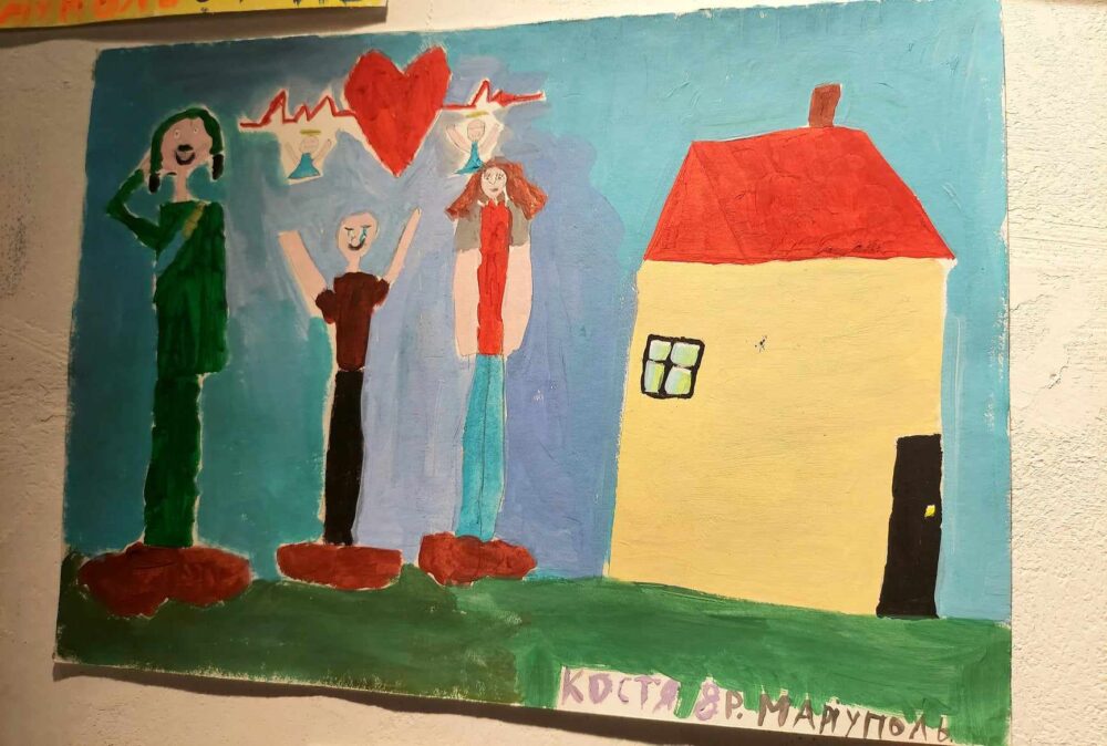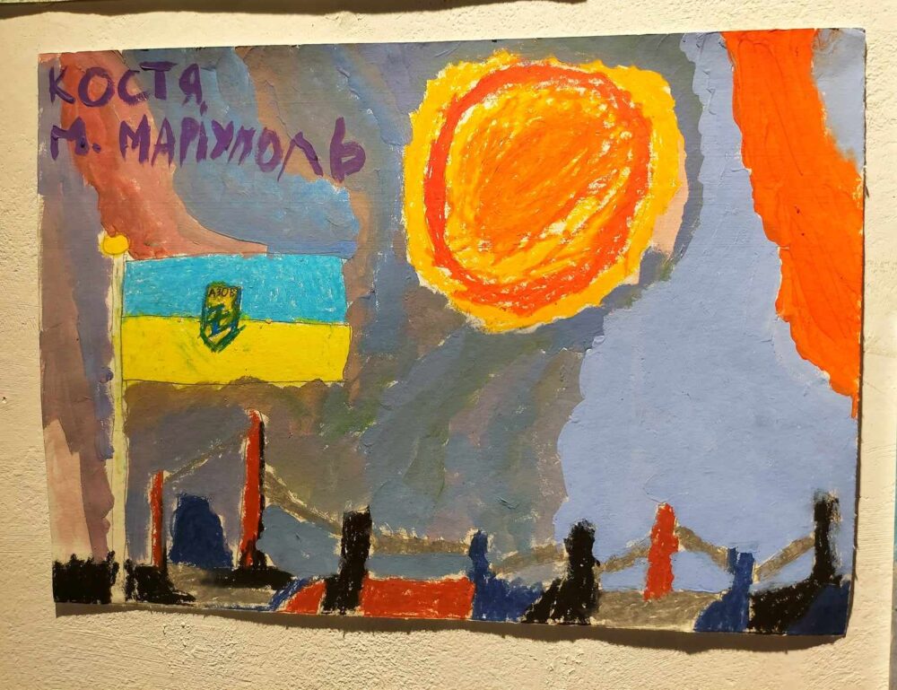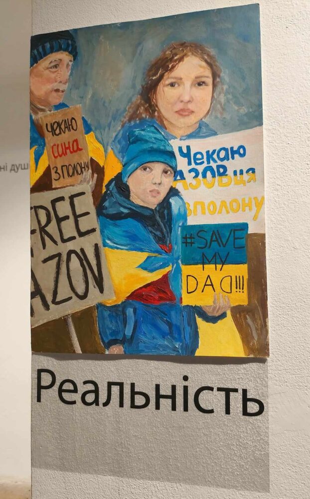 Зокрема на одній з картин Костя намалював маму, дідуся, себе. Намалював він і свої мрії. Ця родина постійно виходила на акції, бо їхній тато-«азовець» з 2022-го був у полоні. «На малюнку реалії – як родина чекає тата з полону. А поруч – є роботи хлопчика про його мрії. Зокрема, куди вони з татом поїдуть, коли він повернеться з полону…», – розповідала під час відкриття виставки художниця.