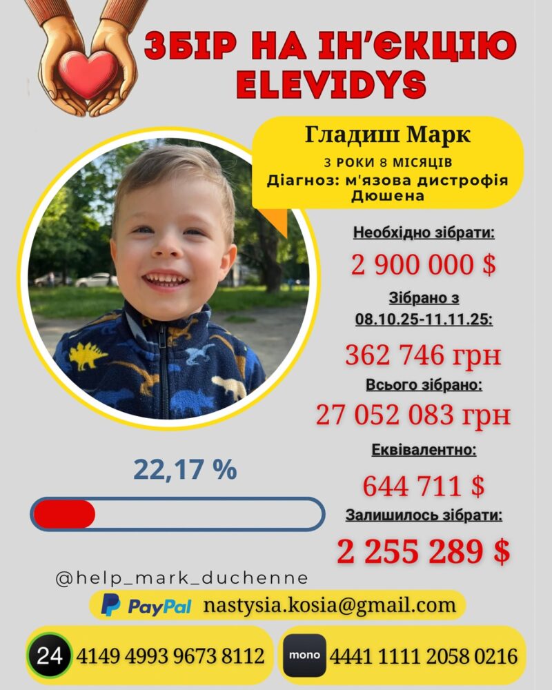У Львові триває збір на ін’єкцію Elevidys задля допомоги трирічному Марку Гладишу, якому діагностували м’язову дистрофію Дюшена. Це рідкісне генетичне захворювання, що поступово руйнує м’язи.