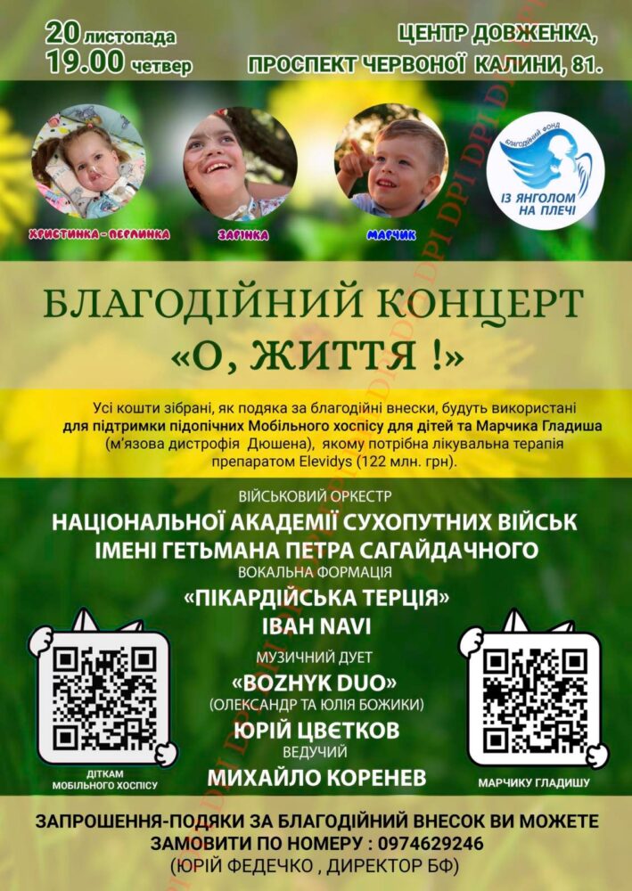 Юрій Федечко зазначає, що 20 листопада, у День захисту дітей, о 19.00, у Центрі Довженка (просп. Червоної Калини, 81) відбудеться благодійний концерт «О, Життя!», який організовує благодійний фонд «Із янголом на плечі».