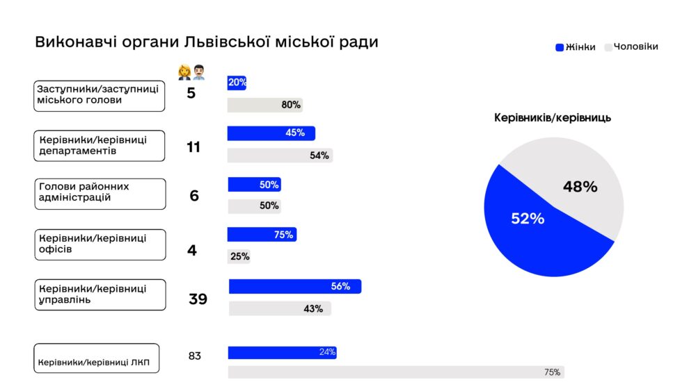 Зараз 52% жінок є керівницями у виконавчих органах Львівської міської ради. Депутатками міськради є 19 жінок (30%) – найбільше за всі вісім скликань. П’ять комісій у міськраді з 12-ти очолюють жінки.
