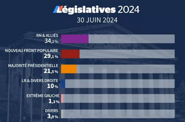 На другому місці – блок лівих партій «Новий народний фронт з результатом 29,1%. Партія чинного президента Еманюеля Макрона «Відродження» та її союзники здобули підтримку 21,5% виборців. Також 10% французів проголосували за республіканців, частина яких може увійти в альянс із ультраправими. Явка на виборах сягає показника 69%.