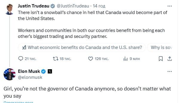 Дональд Трамп також пропонував Канаді стати 51-м штатом США. Американський лідер публікував відповідні фото у соцмережах, а після відставки прем’єра Канади Джастіна Трюдо, Ілон Маск, який, як відомо тісно спілкується з Трампом, назвав у коментарі канадського екс-прем’єр-міністра «дівчинкою».