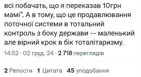 «Можливо, це некоректне порівняння, але в Китаї є такий месенджер –WeChat, обов’язковий для використання громадянами цієї країни, який має щось на зразок соціального рейтингу. Оце цифрова диктатура! А в нашій історії постає просте питання: вас хтось змушує брати участь у програмі «Національний кешбек»? Ні. Ви самі даєте на це згоду. Так само з цією тисячею гривень, яку незрозуміло для чого ввели. Величезні суми витратили на будь-кого і просто так, а можна було знайти інше застосування цим коштам».