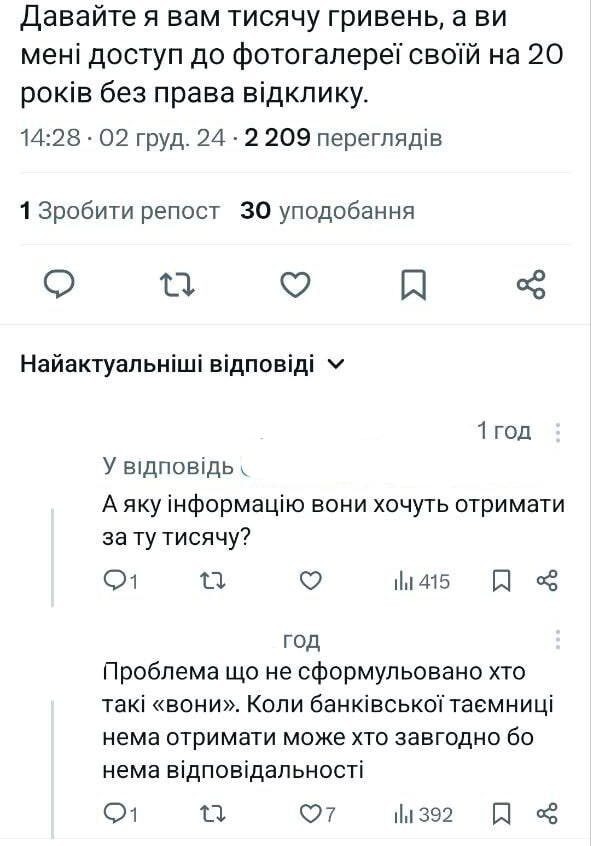 «Тут відповідь дуже проста: є закон про банки і банківську діяльність, є поняття банківської таємниці, є дуже жорсткі вимоги до передачі такої інформації. Банк може, звісно, аналізувати інформацію про транзакції, він усе бачить, проте банки не мають права передавати ці дані, а якщо будуть такі випадки, то може настати кримінальна відповідальність для тих працівників і керівників банків, які це зробили».