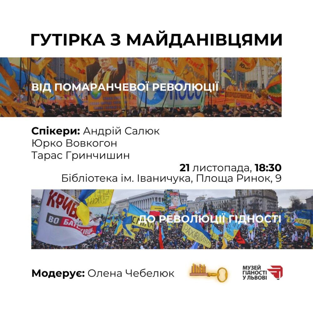 До 20-ї річниці початку Помаранчевої Революції та 11-ї річниці Революції Гідності Музей Гідності у Львові запрошує містян на зустріч-гутірку з учасниками обох українських Майданів. Про це інформує Музей Гідності у Львові.