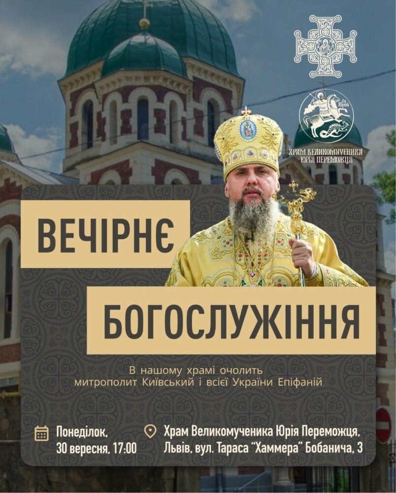«Дорогі брати і сестри, маємо велику радість повідомити про історичну подію для нашої парафії. У понеділок, 30 вересня, з першосвятительським візитом відвідає наш храм св. вмч. Юрія Переможця Блаженніший Епіфаній, Митрополит Київський і всієї України, який очолить Всенічне бдіння (вечірню) у нашому храмі о 17.00. Запрошуємо львів’ян та гостей на спільну молитву за мир в Україні та розділити важливу подію разом нами», – інформують у храмі святого Юрія Переможця.
