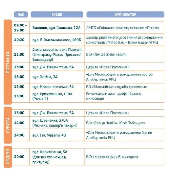 На вул. Кирилівській запрацює центр підтримки, де можна зігрітися, поїсти, переночувати та скористатися додатковими послугами. Окрім цього, у місті діють організації, які надають допомогу бездомним людям та іншим вразливим категоріям, зокрема забезпечують їх гарячими обідами.