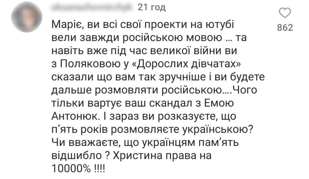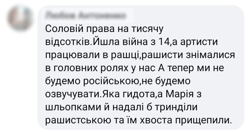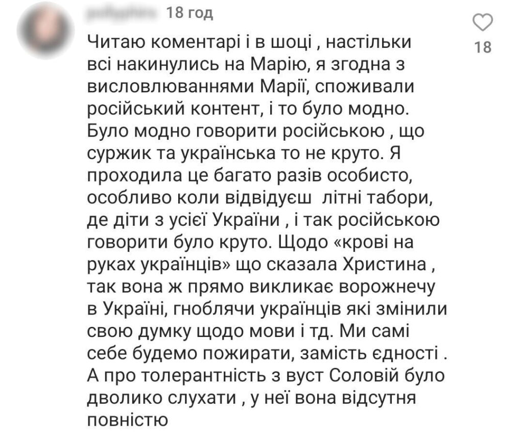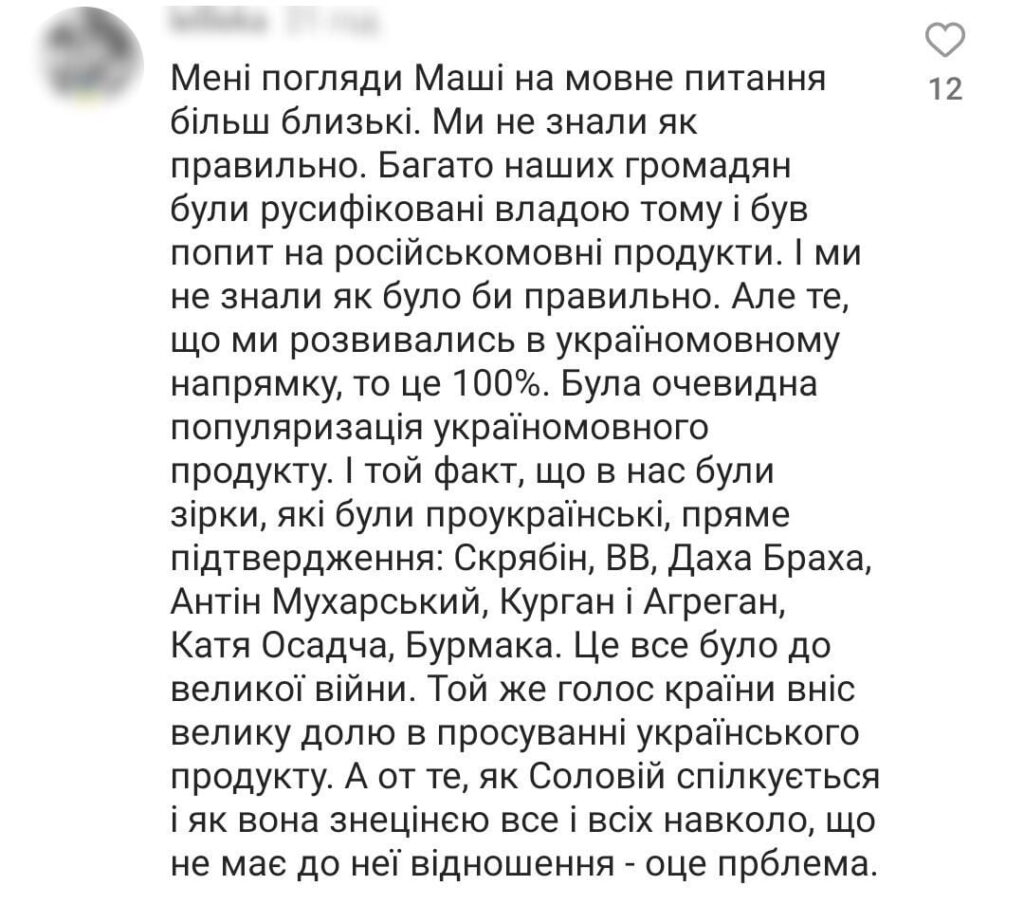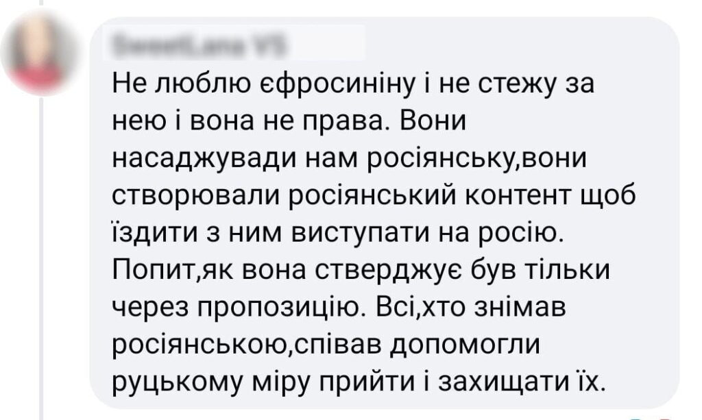 Отже, Христина Соловій звинуватила представників українського шоубізнесу в тому, що вони роками «будували культурні мости між Росією та Україною» та що в них «на руках, на серці й на душі завжди буде кров». Проте Марія Єфросиніна зауважила, що така категоричність суджень призводить до розколу всередині країни.