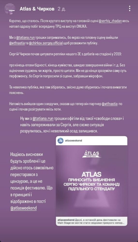 На фестивалі Atlas, який відбувся у Києві 19 — 21 липня, стався інцидент: Сергія Чиркова, стендапера, ведучого подкасту «Запах слова», вивели зі сцени під час його виступу. Як зазначив один з відвідувачів, Сергій просто зачитував текст промови Володимира Зеленського з дебатів на стадіоні. Під час цього дійства на сцену вийшов співробітник команди заходу, забрав мікрофон у коміка й попросив його піти.