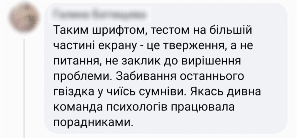 Оксана Мороз, авторка книг «Нація овочів», «Як не стати овочем», «Боротьба за правду», зауважила, що така практика як трансляція думок цільової аудиторії у слоганах не підходить для реклами гарячої лінії психологічної допомоги під час війни.