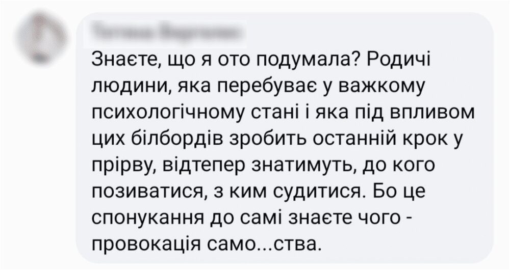 Художник, плакатист та ілюстратор Нікіта Тітов теж висловився про цю рекламу: «Банальна фраза, що слова лікують і слова калічать, не є вигадкою, особливо коли вони написані великим шрифтом і всюди. Тож як колишній фахівець з реклами та людина з власним досвідом психічних розладів, закликаю не лише до совісті, а й відповідальності за життя інших людей».