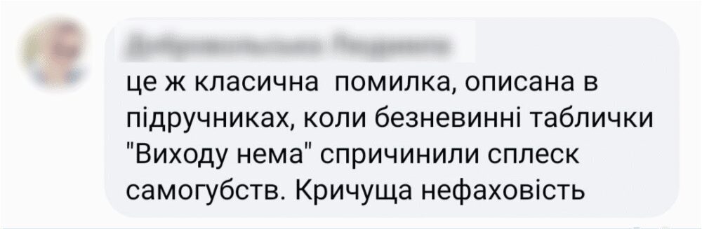 Зокрема, комунікаційниця Марія Кравченко написала, що такі гасла не спонукають звертатися по допомогу, а радше відштовхують, адже найважливіша інформація на цих плакатах другорядна й непомітна.