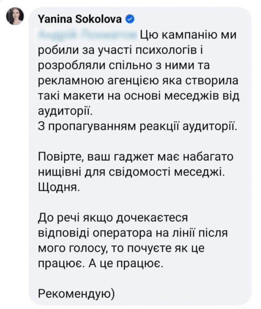У одному з коментарів Яніна Соколова написала, що цю кампанію розробляли, зокрема, з психологами.